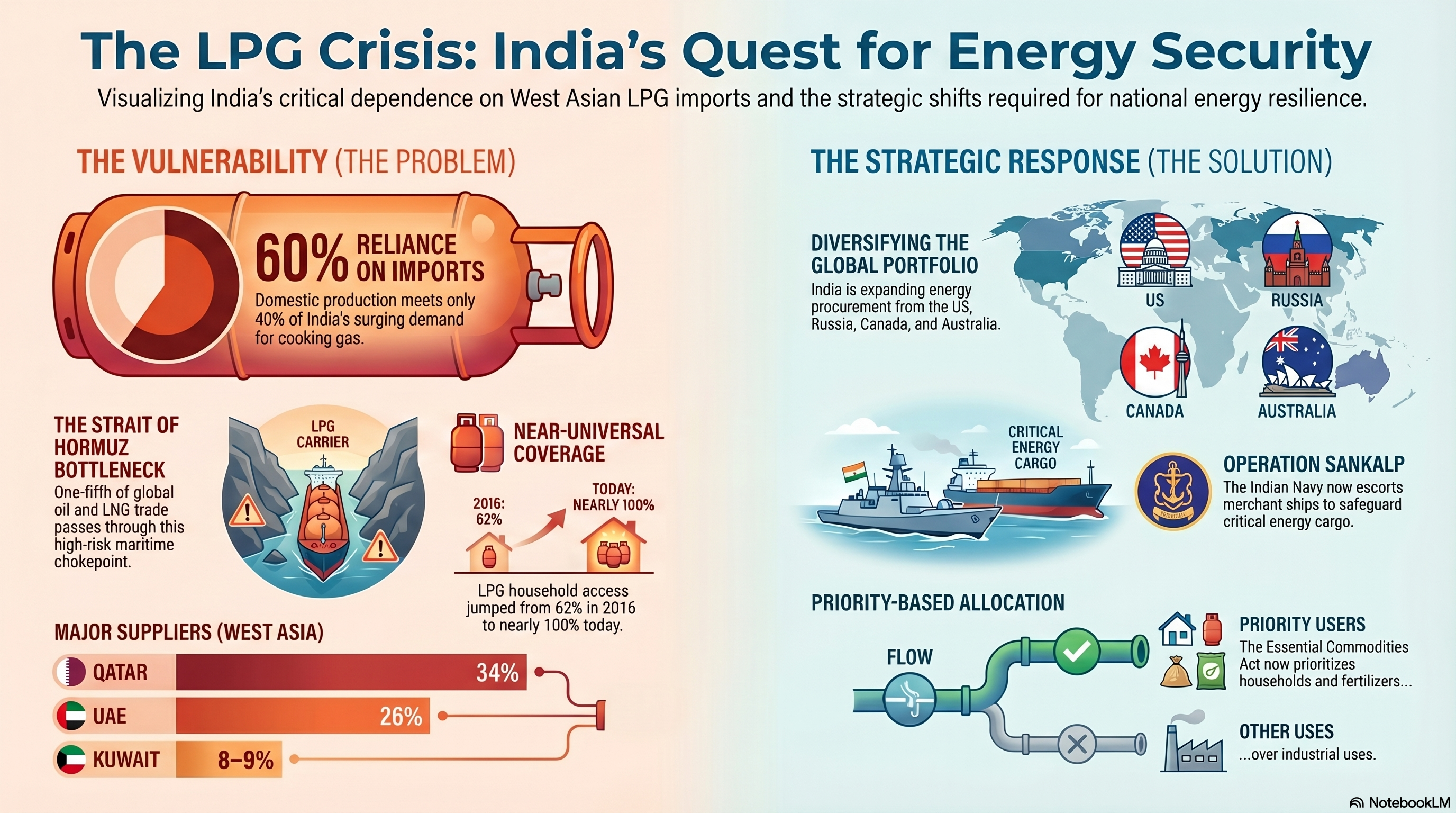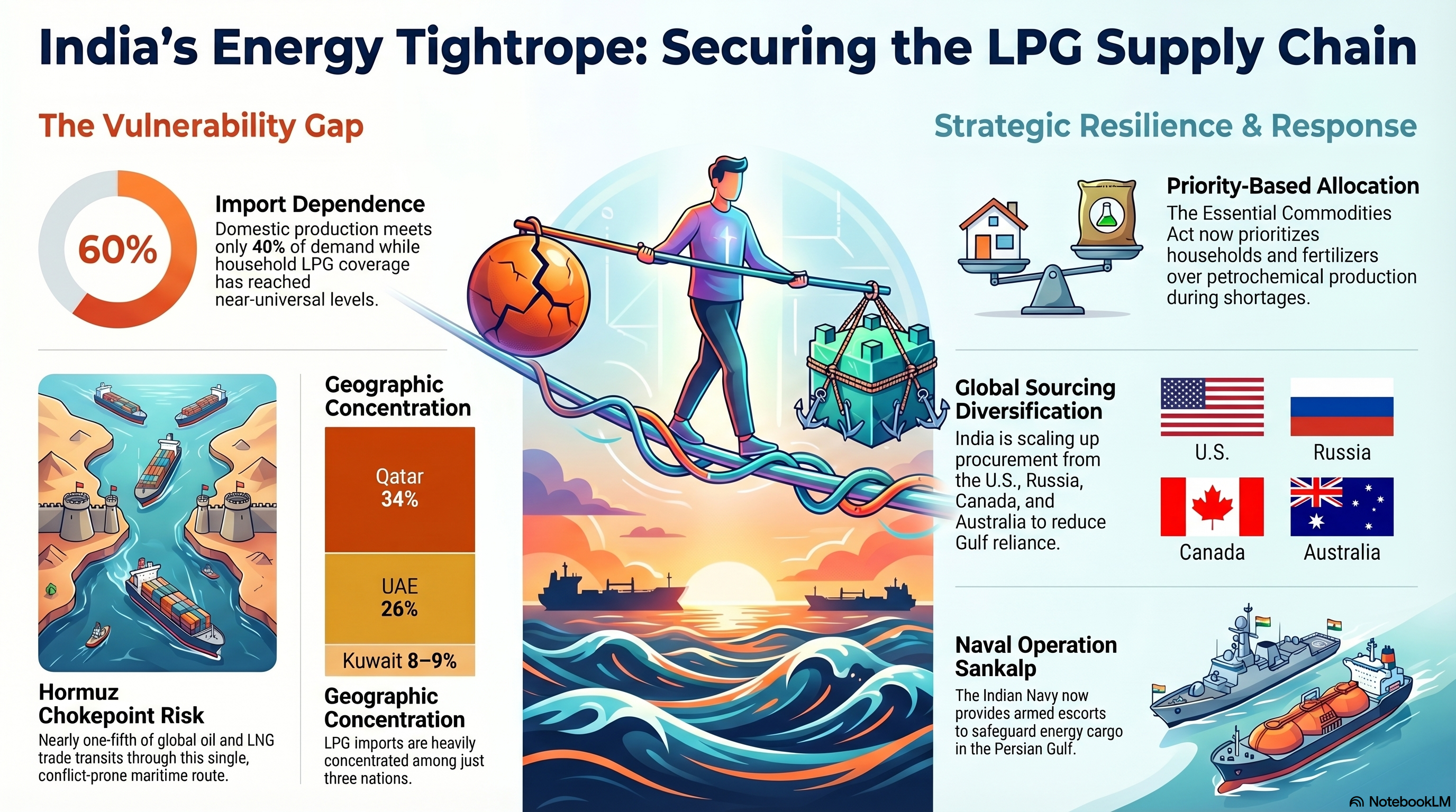 The Iran–US conflict has transformed India’s LPG import dependence into a strategic national security issue. Although emergency interventions may provide short-term relief, the crisis has exposed deeper structural weaknesses in India’s energy framework. Going forward, India must move beyond reactive crisis management and adopt a long-term strategy centred on diversification, strategic reserves, domestic production enhancement, and maritime security to build a resilient and future-ready energy ecosystem.